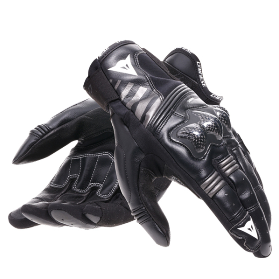 NEW Short leather motorcycle gloves with ergonomic carbon knuckle protection and padding on palm, little finger and thumb. Easy fit, Smart Touch, high riding sensitivity and extreme comfort.